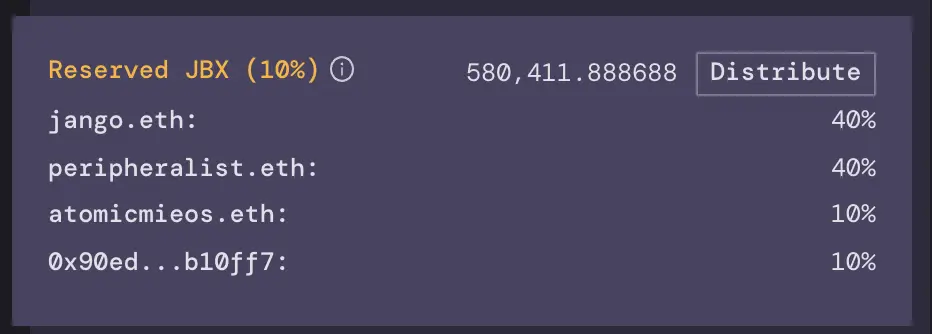 The first JuiceboxDAO configuration includes a preprogrammed reserved JBX rate of 10%, with distributions to predetermined recipients.