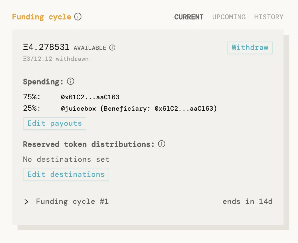 The Juicebox protocol does this by allowing projects to make commitments about how its cashflow will be distributed *before ever receiving payments, signaling to users how their money will be spent ahead of time. *It works really well as a payment terminal and programmable treasury for projects that have mostly predictable costs (like staff payouts, service subscriptions, donations, budgeted initiatives, etc.), and who want to automatically reward their community as they become successful.