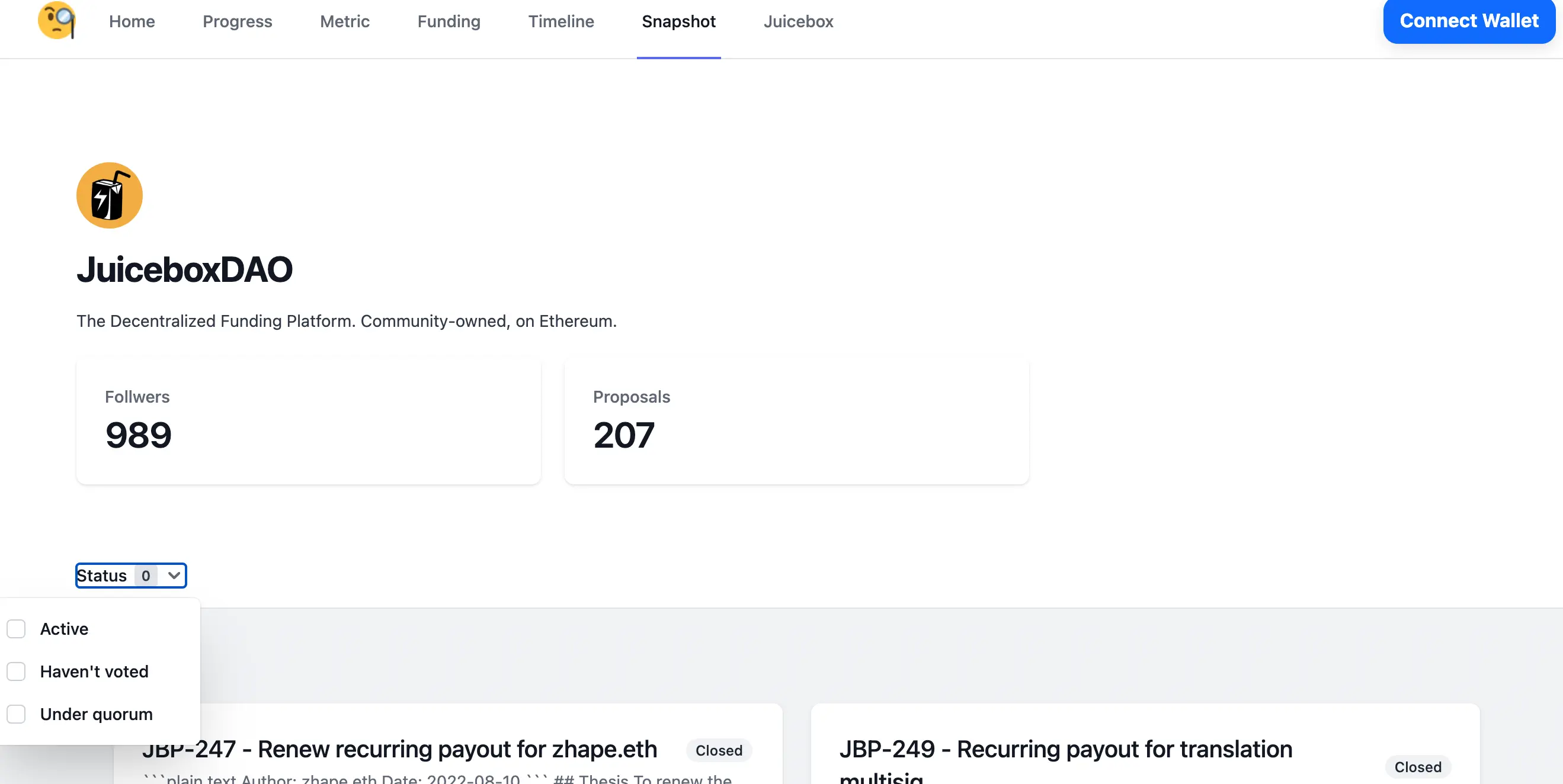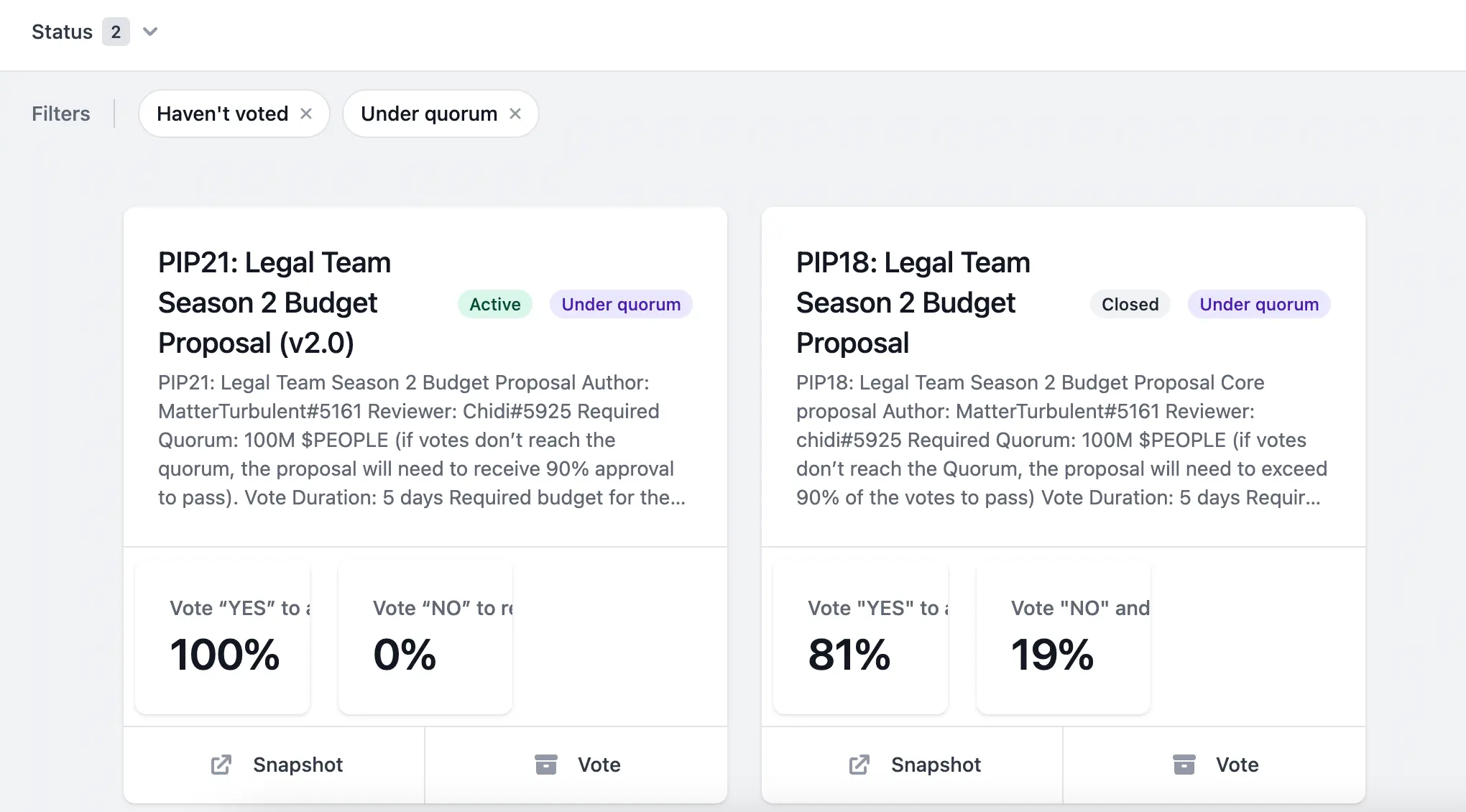 nicholas: There's a feature for whether proposals are have met quorum yet or not, next to where closed. If there were active ones, you can sort, for instance, by haven't voted which means that the connected wallet has not yet voted on, and add Under quorum to see all the proposals that you have not voted on and they have not met quorum yet.