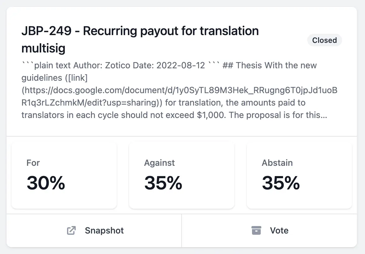 jigglyjams: Yeah, totally. That's been on my mind lately, too. I could imagine, as long as we're still relying on Snapshot, in the project creation UI, you could just check a box and create a snapshot space, and we could send a transaction to create that. Along with that, we can add Nance instance once it's at that level. I'm working on submitting transactions for @twodam's Gnosis Safe payout changes. I want to work with @twodam to have Juicetool be the frontend. if possible. I can see that being really beautiful. It looks amazing, @twodam. It's been super cool. I watch you develop it and excited to see more.