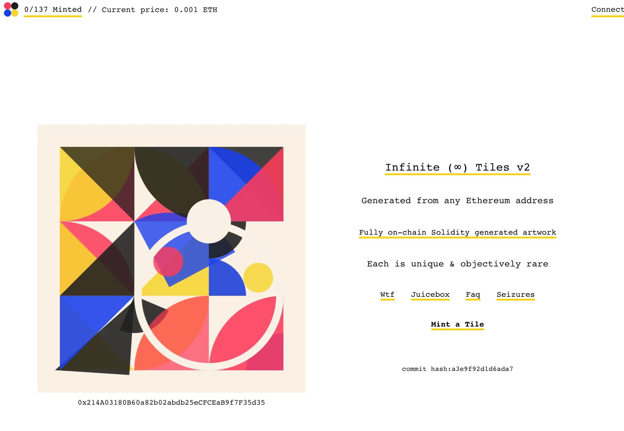 peri: I can talk on the Tiles project for a second. Tiles is an NFT art project that I put out about a year ago. It was actually launched on day 1 of Juicebox lifetime, it was Juicebox project No.2, next to JuiceboxDAO. The artwork is rendered using a server, so you can basically buy these NFTs but their artwork is rendered off-chain, which is not as cool as rendering artwork on-chain.