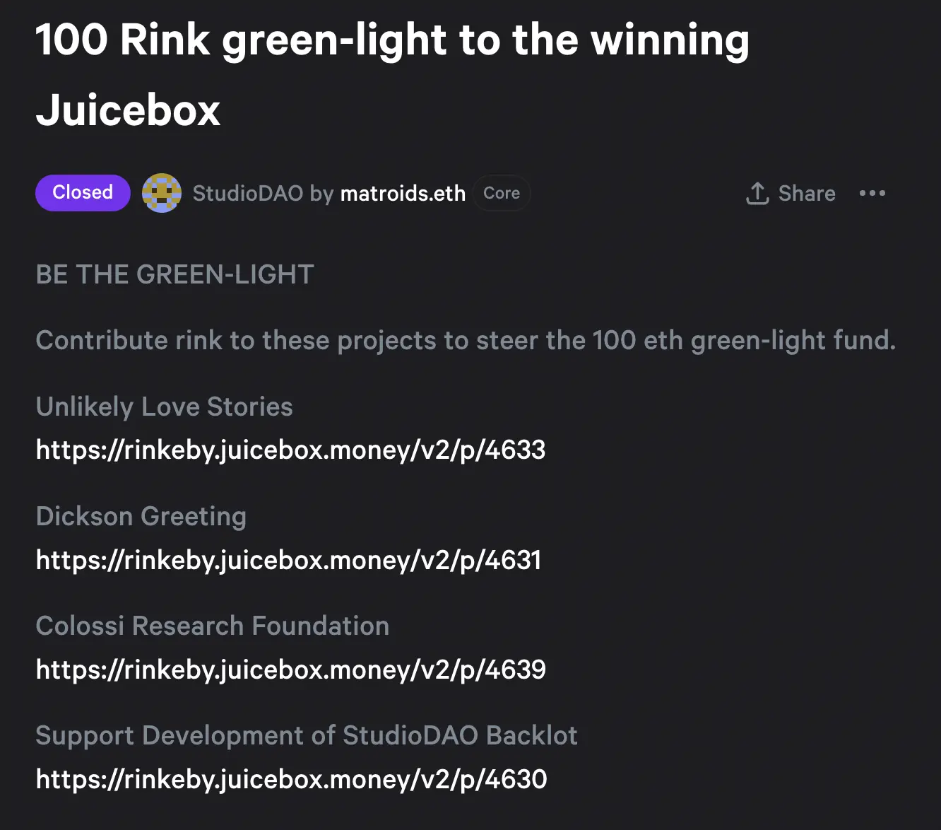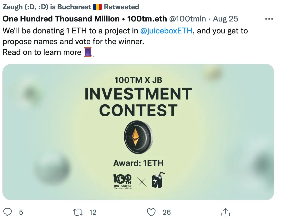 They're trying to get attention of nice projects around web3. Because they're building a city and they think that building a city of the future is supposed to have creative people creating awesome stuff and they see Juicebox as one of those spaces, so they wanted to do a contest for giving a prize for a Juicebox project. They reached out to me to help organize that and we put out a JokeDAO contest which is going to start tomorrow,giving out 1 ETH to a Juicebox project that gets more votes. They're opening the contest tomorrow. Everyone is welcome to submit a Juicebox project and go to their Discord server to get tokens to vote.