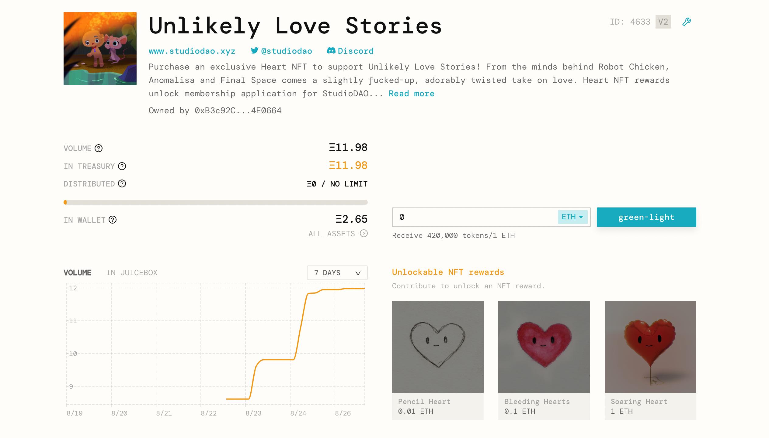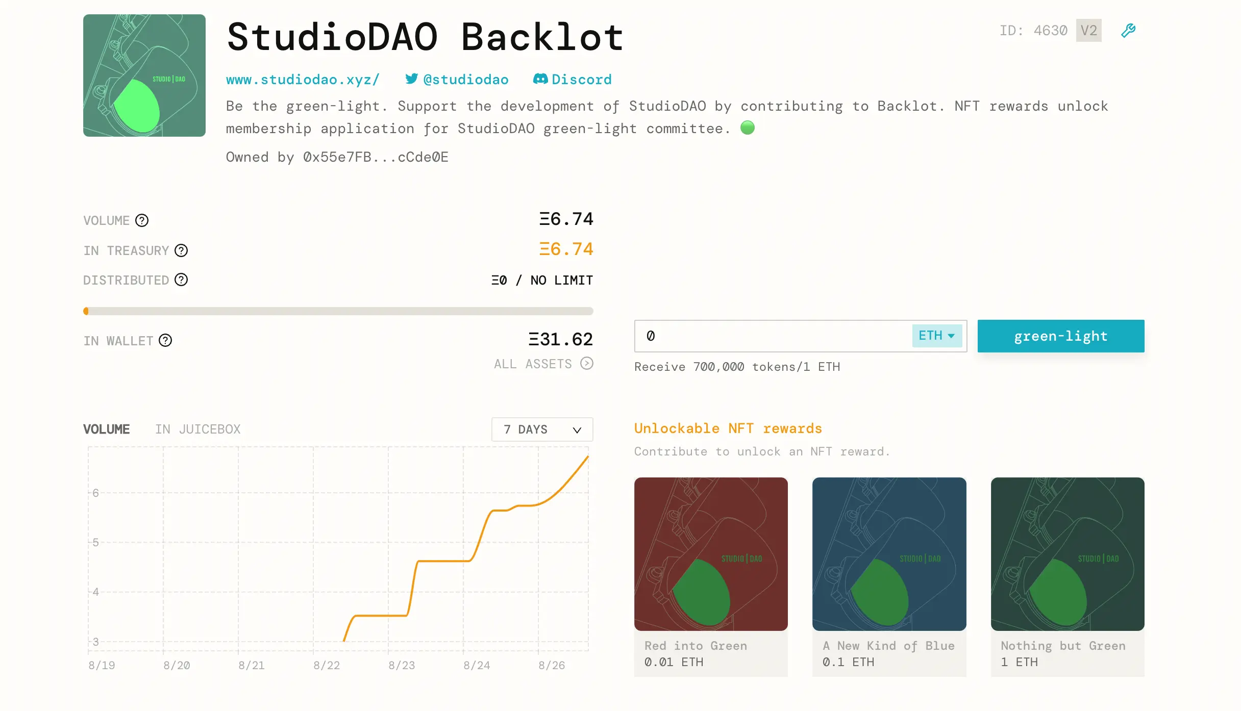 The funds distribution will be 90/10, 90% of the funds will go to the project itself, and 10% will go to the StudioDAO Backlot juice box and generate more green-light power tokens that go back to the filmmaker in exchange for a 10% fee.