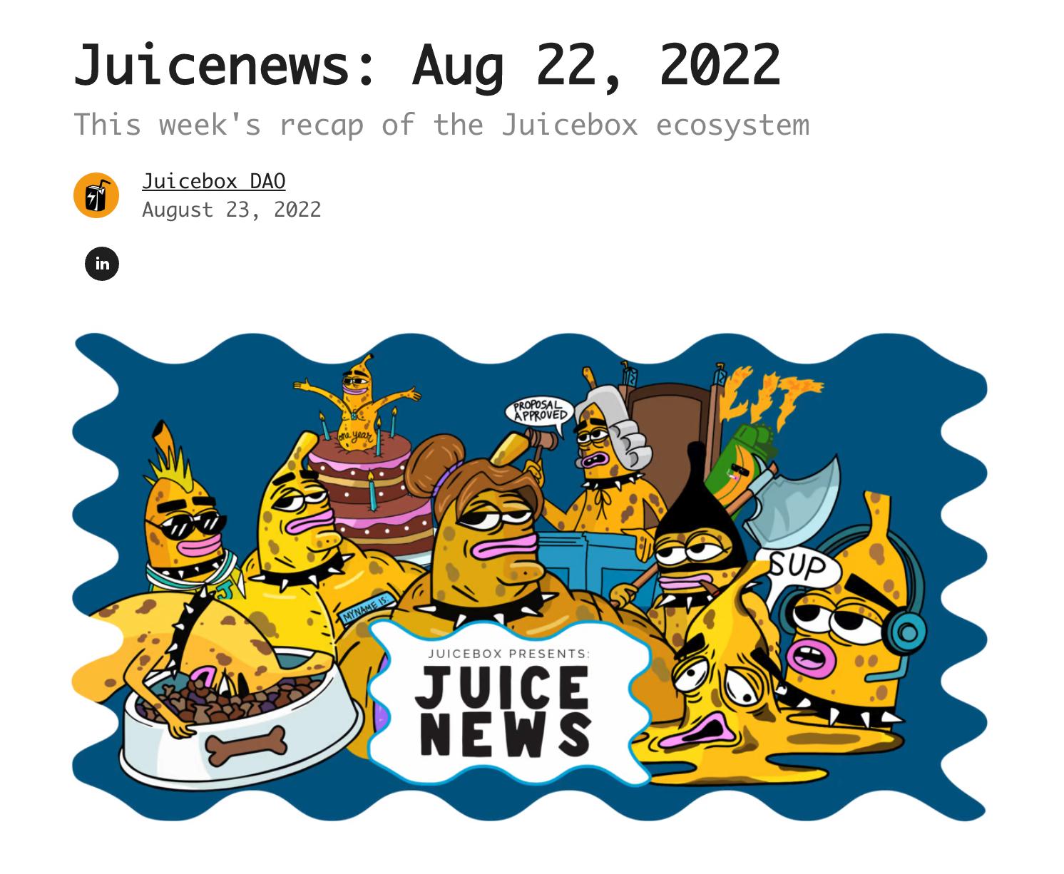 nicholas: I think this is gonna be great for getting better distribution or increasing distribution of stuff we're already producing, because I think a lot of people are consuming the Juicebox content that several members of the DAO are producing via Twitter and Discord. But to try to reach people who maybe not on Twitter or not in the Discord regularly, you can imagine, if there was a newsletter sign-up link on the website during ConstitutionDAO or AssangeDAO periods, some number of the people who participated in those fundraisings might have stuck around for the newsletter. So I think a newsletter is a really good experiment to see if it engages people. I really love what you did with the layout and everything, it looks great.
