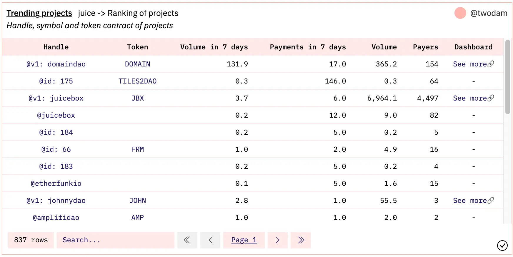 jango: @twodam, the frontend chops are fantastic, this is looking great. You've been constrained by the Dune UI just writing queries, and now actually refactoring the interface elements is a huge unlock, this looks fantastic.