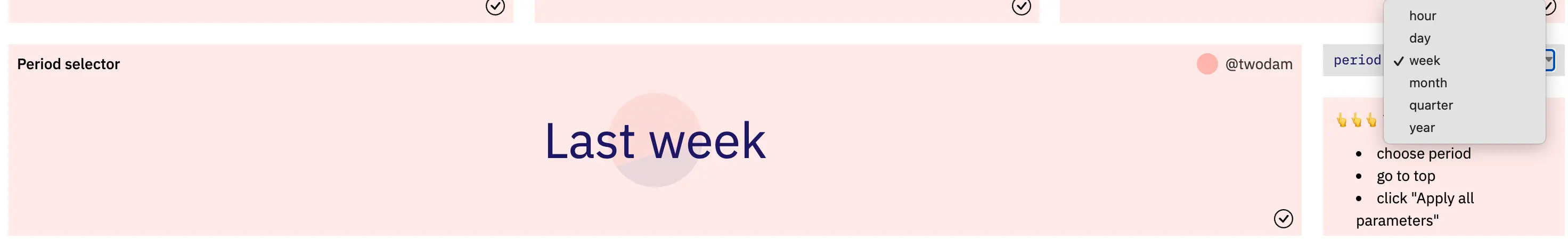 After you select the period, scroll back up and click apply all parameters, and all the stats will refresh using this new period.