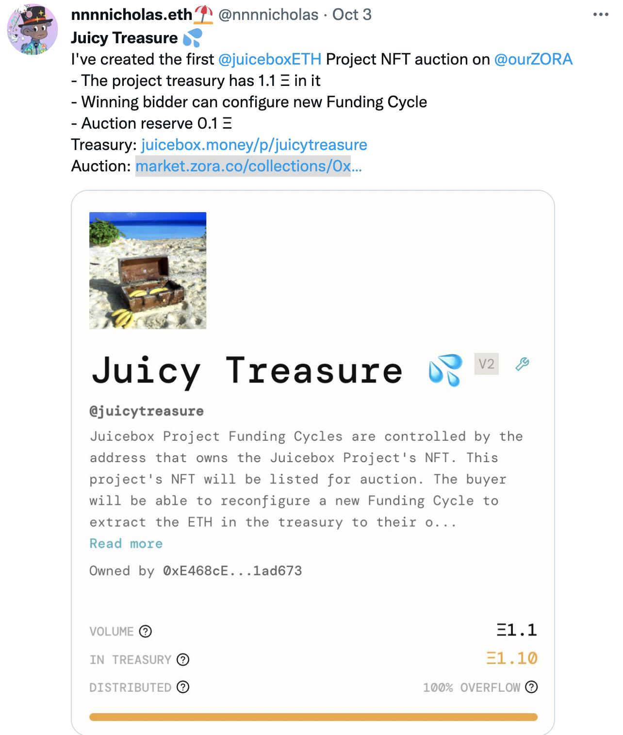 Nicholas set up a Juicebox project called Juicy Treasure and put the project ownership NFT on auction on Zora, as a nice little experiment to get more people thinking about the different mechanisms of Juicebox.