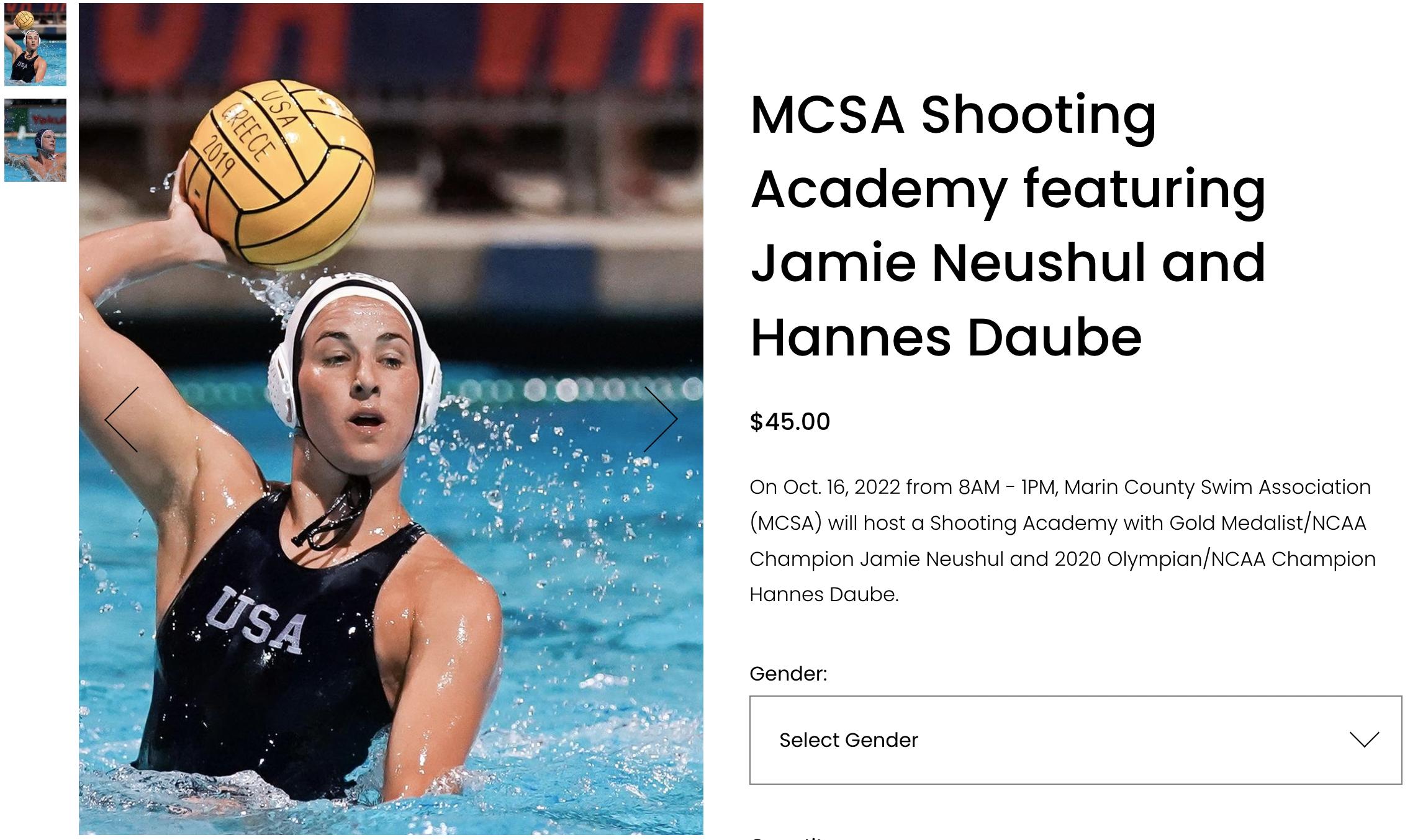 MCSA(Marin County Swim Association) is a nonprofit providing opportunities for people who can't afford to be in some high level tournaments, camps or clinics. On Oct. 16, 2022, MCSA will be hosting a Shooting Academy with Gold Medalist/NCAA Champion Jamie Neushul and 2020 Olympian/NCAA Champion Hannes Daube. This event will only charge $45 per person and MCSA will cover the balance of around $2,000 total.