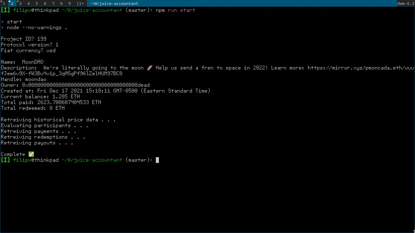 If you want to get accounting for a certain project on Juicebox, you can input the required parameters and get some information for this project in return, which can be pretty useful for some project creators looking to deal with taxes etc. in a given jurisdiction.