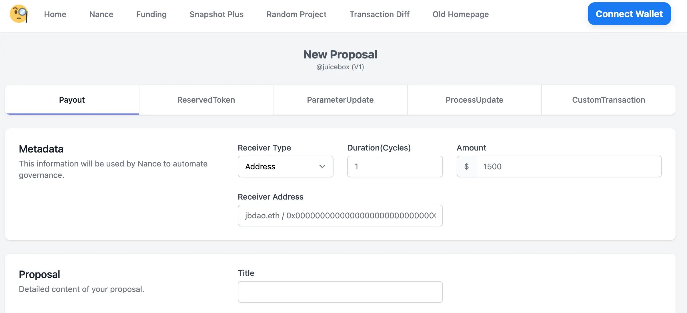 This template allows you to select a payout that goes to an address or a project, and specify the amount and number of cycles. And also it will resolve ENS name in the Receiver address.