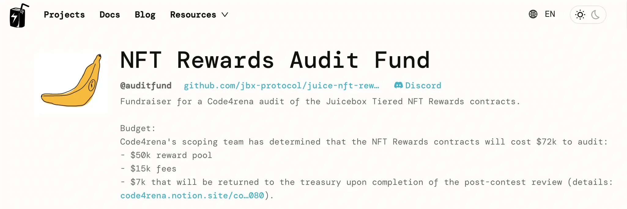 For context, recently Code4rena is interested in creating some Juicebox projects for any smart contracts or protocols so that anybody can crowdfund and start the audits for them. Hopefully, this Audit Fund project and proposal can help to push forward the JuiceboxDAO X Code4rena integration partnership by discovering a typical JuiceboxDAO dogfooding solution first.