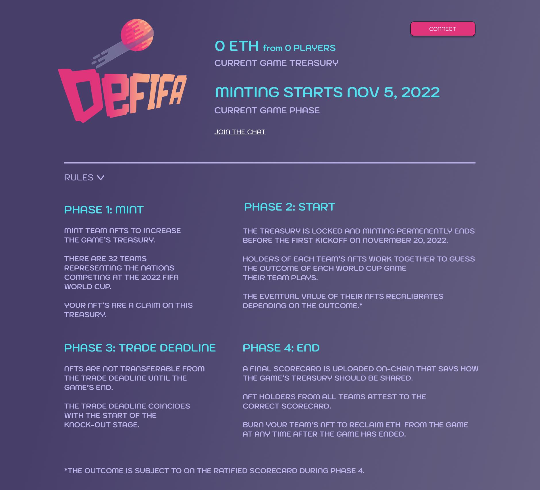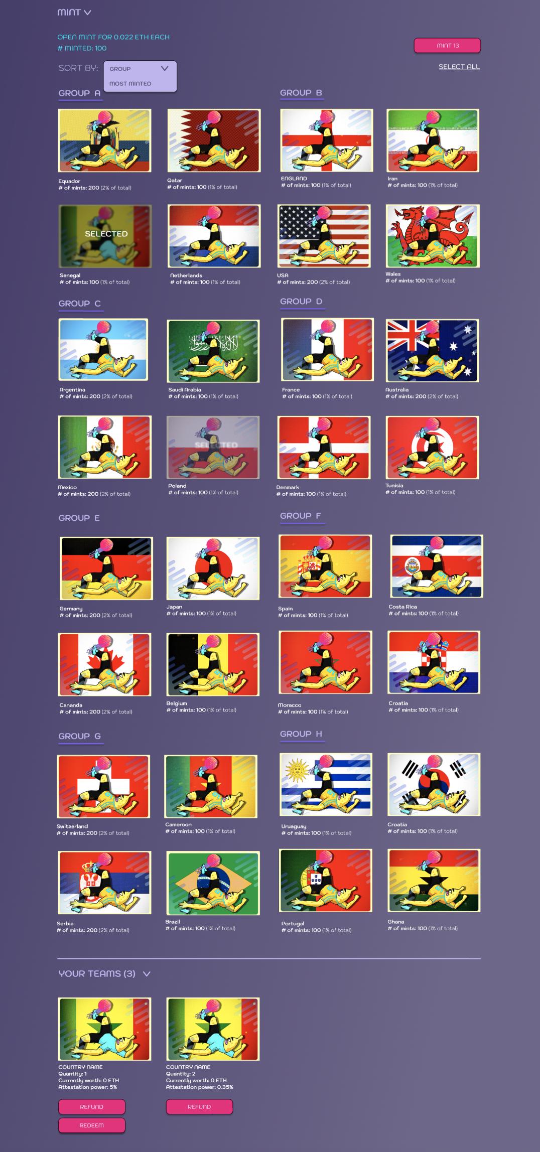 There's going to be 32 NFTs which are each different tiers in the NFT tiered reward contract. In the two weeks leading up to the tournament, anyone can mint any team for the same price (currently saying 0.022 ETH). As the mints increase, so does the game's treasury. The NFTs are in turn a claim on the treasury. During these first 2 weeks, you can burn your NFT to get your funds back, with 1:1 redemption.