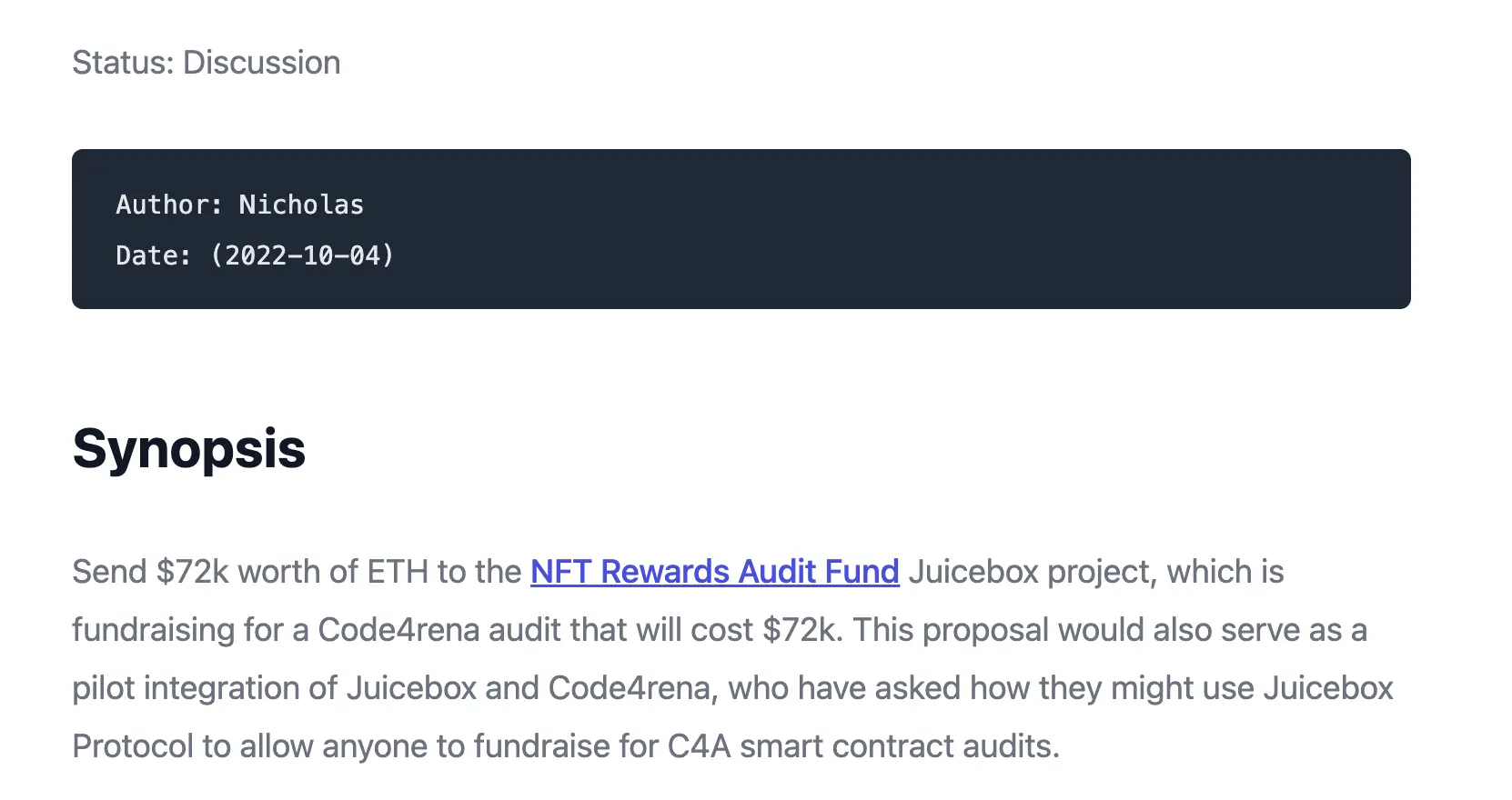 Also Nicholas submitted a proposal for JuiceboxDAO to support and fund this audit contest. Once approved, funds will be distributed into the treasury of the Audit Fund project, to be paid to Code4rena later on.