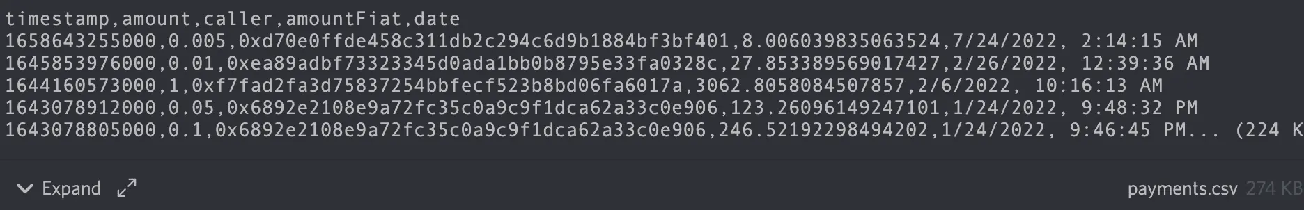 Let's say we want to get accounting for TilesDAO, we put in the project ID, the protocol version and put in the fiat currency that we're using, it will touch things and write to the folders. For example, if we open up payments folder, it gives us the time stamp, ETH amounts, fiat conversion at the time of payment, and the caller.