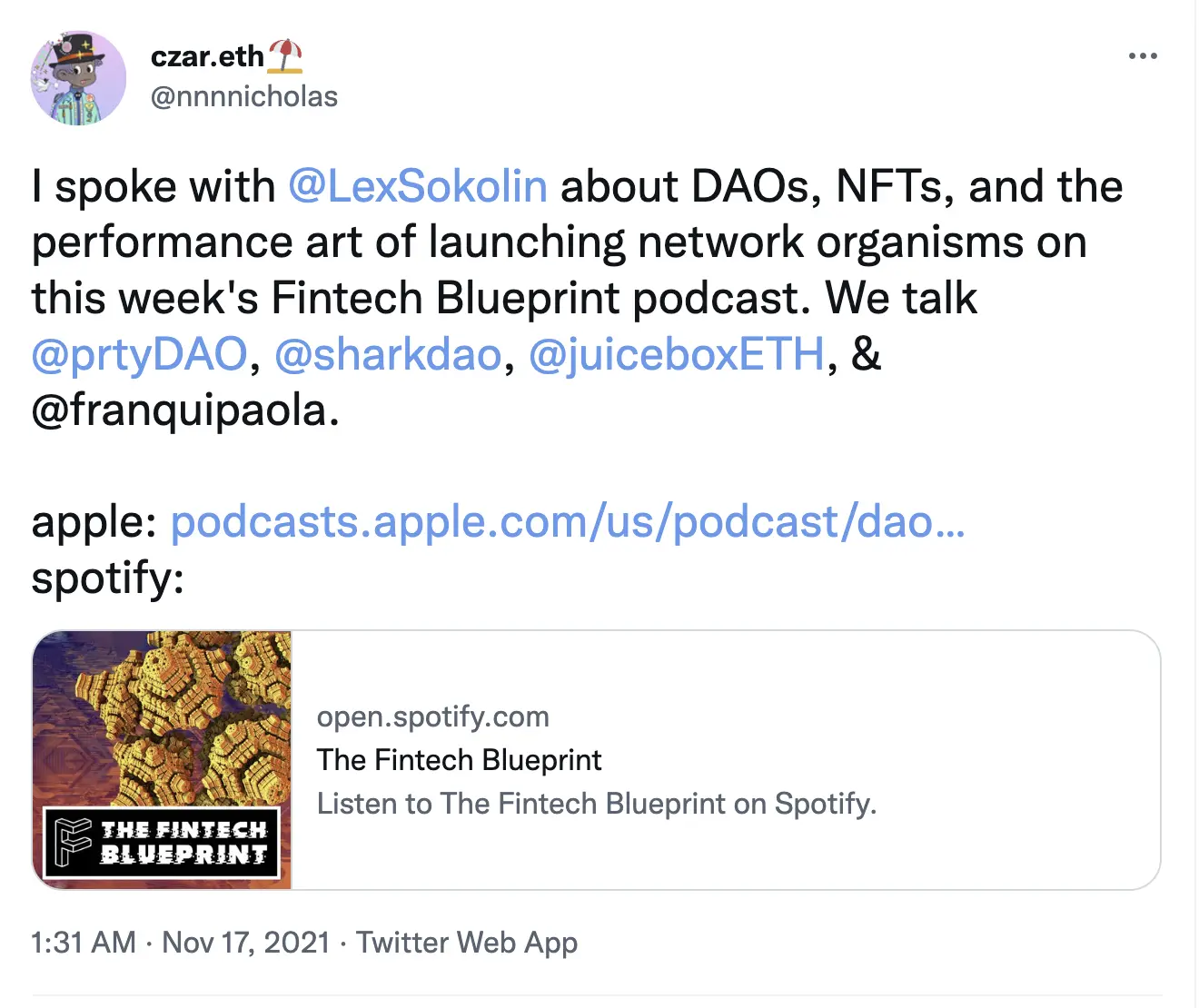 通过这篇文章,我们会对 DAO 的各种基本功能进行定义,还会介绍实现这些功能需要用到的工具。本文内容受到 Juicebox 贡献者 @nnnnicholas 的 The Fintech Blueprint Podcast 播客的启发;如果你更喜欢听语音内容,去听一下
