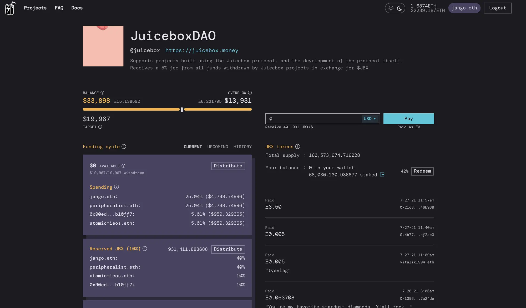 支付给项目的每一笔付款都会铸造及分发项目代币给付款人,同时按保留的百分比(代币保留比率)把其余代币分配给项目方预设的一组钱包地址。每笔付款铸造出来的代币数量随时间推移受项目设置的折扣率复合影响,这是对早期捐款人的一种激励机制,因为他们承担了更大的风险。项目募集到的资金,超过筹款目标的部分就是溢出。这个溢出既是项目的长期跑道,也是社区的资产金库。每个代币持有人对溢出都有主张的权利,他们可以通过赎回(销毁)代币来行使这个权利。