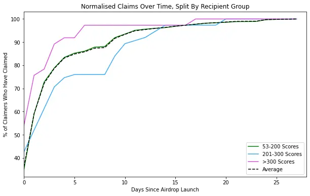 Finally, we looked at how quickly each cohort claimed their JBX. Interestingly, the 53-200 tier fared better than the 201-300 tier in this metric as well.