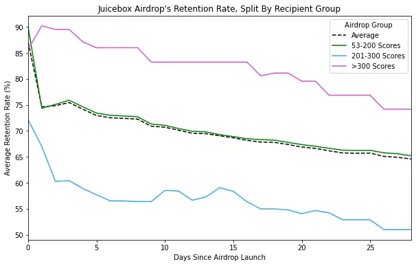 The first graph shows retention rates 28 days after several major airdrops. The Juicebox Benefits Airdrop had unprecedented levels of hodling!