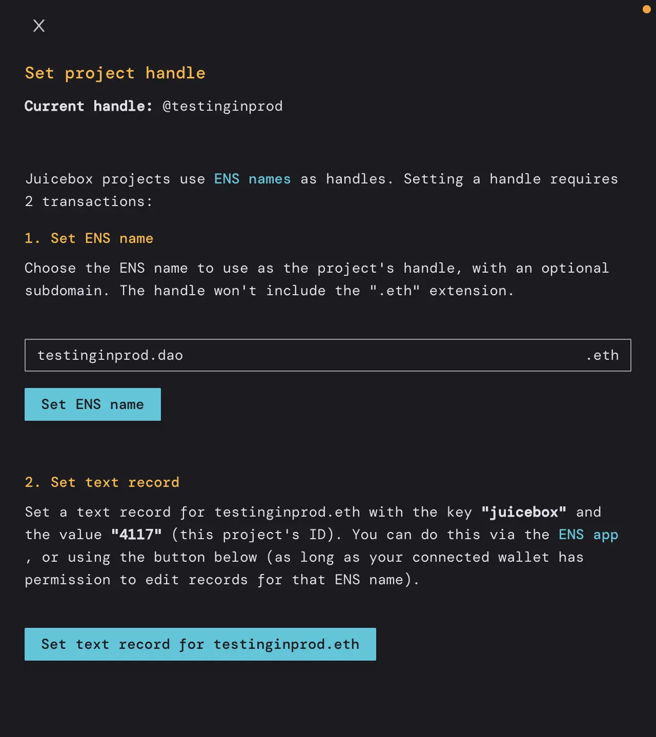 We've got a two-transaction-process for setting a project handle. And so the way that this works is we decided to use ENS names to handle the uniqueness of project handles what I mentioned earlier for making sure that handles be passed around and exchanged. There's a lot of complexity there that ENS has already solved really beautifully and so we built the system around ENS names. The idea here is that if you want to use a handle for a project you will need to own the matching ENS name. So for example, I just got this ENS name on rinkby testinginprod.eth and this would allow me to set the handle of this project to testinginprod. So I'm gonna do two steps here,