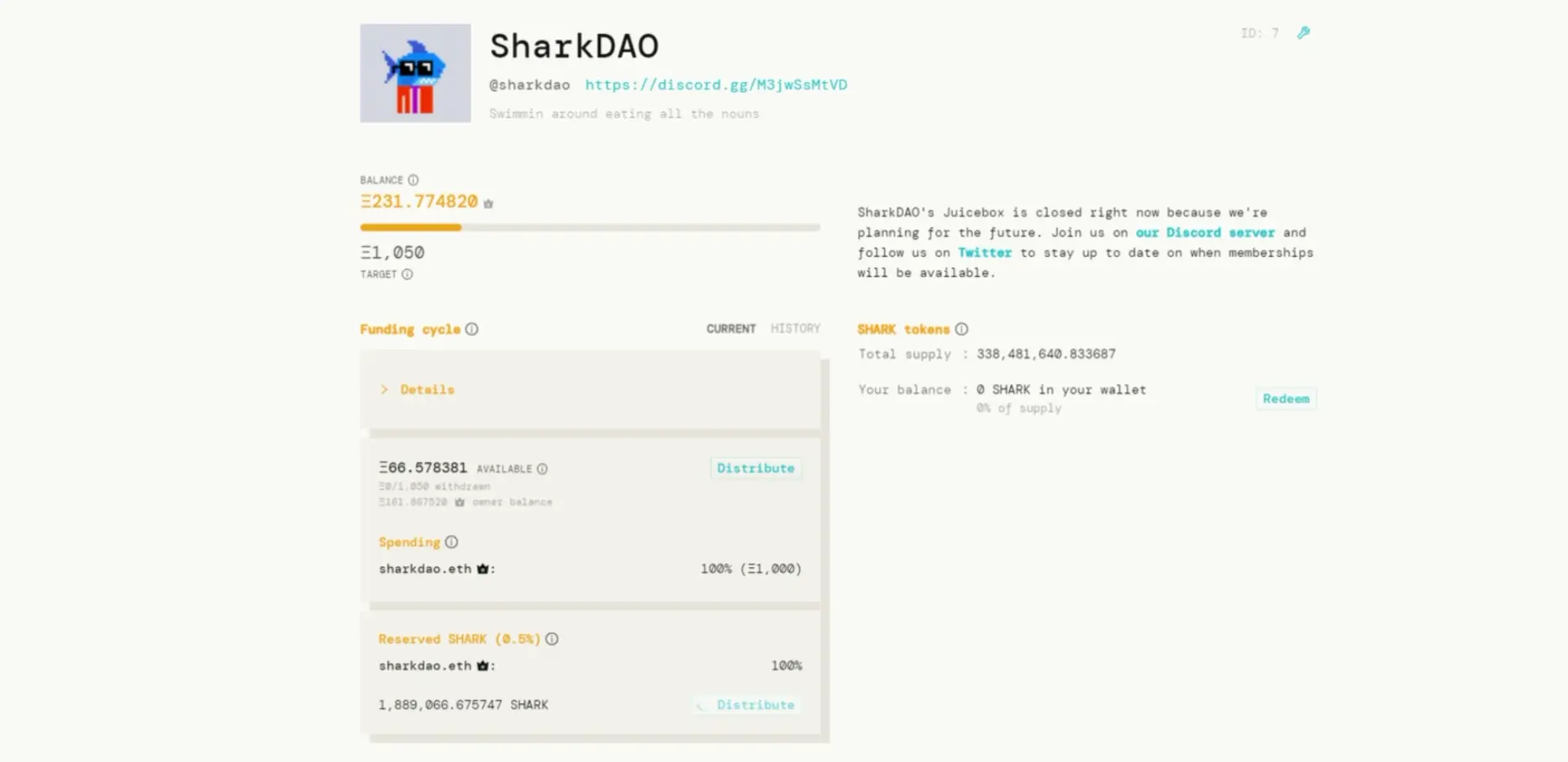 • SharkDAO does not use funding cycles with preset durations, meaning changes can be executed on-demand.