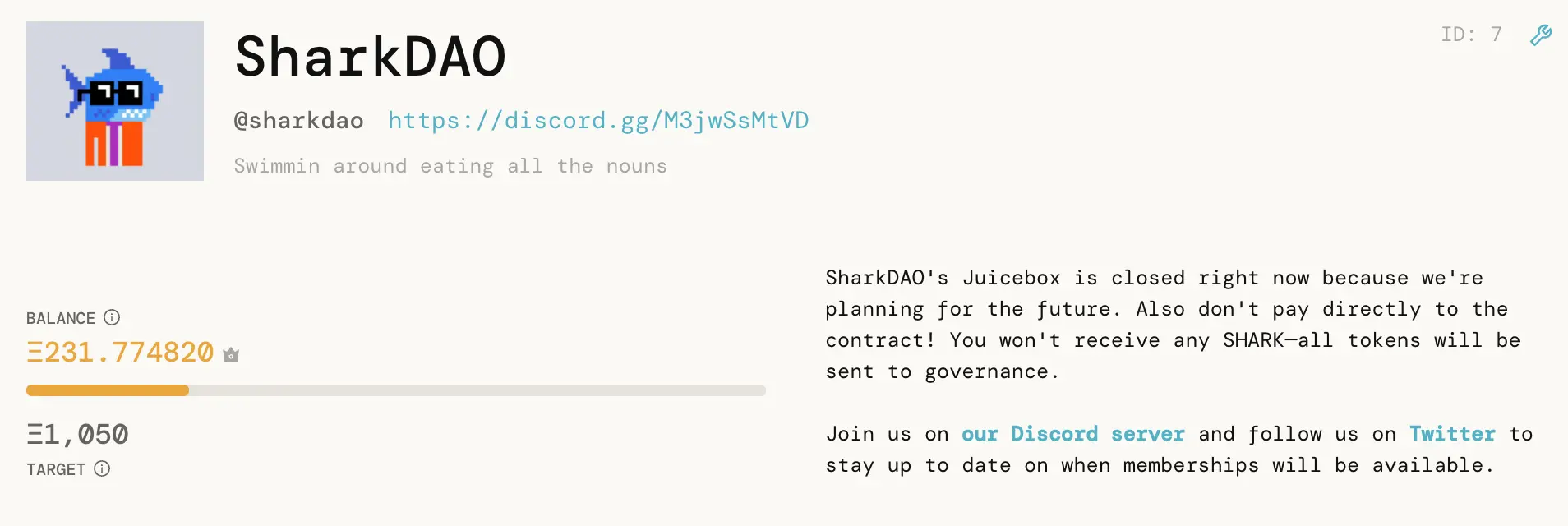 • SharkDAO's Juicebox project is owned by a Gnosis multi-sig requiring 3/5 signatures. I'm one of the signatories.